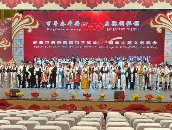 本网消息 为庆祝建党100周年、西藏和平解放70周年,5月20日,由中共那曲市委员会、那曲市人民政府主办,那曲市委宣传部、那曲市文化和旅游局承办的那曲市庆祝西藏和平解放70周年主题文艺晚会在那曲大厦影剧院圆满举办。现场观众多达1000余人。弘扬主旋律,晚会以奋斗百年路 启航新征程为主题,以“脱贫攻坚、永远跟党走、祖国的温暖”为内容,讴歌中国共产党人领导各族人民艰苦奋斗的丰功伟绩。